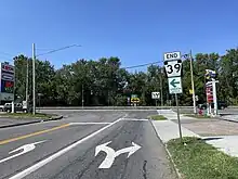 In 2009, PA 39 was widened to five lanes (two lanes in each direction with a center turning lane) when a new shopping center near the intersection of PA 39 and Progress Avenue was built.[26] At the same time, West Hanover Township made improvements to the area surrounding PA 39's interchange with I-81. Prior to the improvements, there was only one traffic light in the vicinity, located at Jonestown Road. Several traffic lights and two additional lanes with a center concrete barrier was added to handle the increased truck traffic caused by the construction of warehouses nearby in 2003 and 2004.[27][28]