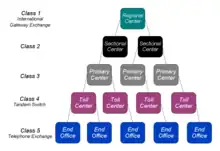 Please note that the currently attached diagram of switch hierarchy is incorrect, as it identifies Class 1 points with International switching. International connections were located in places generally close to cable, later satellite, termination locations, and were not directly related to Class 1 switches. Major international connection points were located in Oakland, California; Miami, Florida; and New York, New York, with a number of secondary international operator toll points. Only after the rapid expansion of ESS terminal offices did operator handling of international calls begin to be off-loaded into the domestic network structure, as international calling services began to be customer dialable, ca. the mid-1980s. This in part paralleled the demise of the five-level hierarchy, so identification of international switches and class one offices is incorrect.