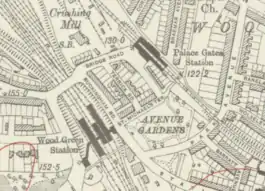 Competing as it did with other nearby railway lines and the Underground's Piccadilly line, by the 1960s the Palace Gates line was unprofitable and the line closed to passengers on 7 January 1963[1][2] and to freight on 5 October 1964.[3] Following closure the station was demolished and housing built on most of the site. A short section of the station site at its north end is occupied by Network Rail sidings alongside which are traces of the platform ends. The remains of part of the embankment forming the southern approach to the station can still be seen, including the abutments for the bridge taking the line over Park Avenue.