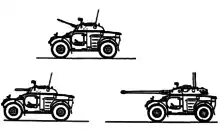 To provide a complete family of wheeled armoured cars, Panhard used AML components to engineer a small personnel carrier, the Véhicule Transport de Troupes, better known as the Panhard M3. The M3 consisted of a boxy, all-welded, hull with an engine relocated behind the driver in order to provide a large troop compartment at its rear. Its wheelbase was also increased from the AML's 2.5m to a higher 2.7m. and the track from 1.62 to 2.5m. In spite of this, maintenance alongside the AML fleet is rather simplified, given that both vehicles share a 95% interchangeability in automotive parts.[7] The export success of the AML and M3 led directly to the development of the Panhard ERC 90 Sagaie and Panhard VCR, respectively, which were six-wheeled and could carry a wider range of heavy weapon systems.[23]