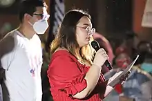 Panusaya Sithijirawattanakul[1] also known as Panasaya Sithijirawattanakul[2][3] (Thai: ปนัสยา สิทธิจิรวัฒนกุล; RTGS: Panatsaya Sitthichirawatthanakun; nicknamed Rung or Roong; born 15 September 1998) is a Thai student political activist and university student leader who is also the spokesperson of the Student Union of Thailand. She is well known for her criticism of the Thai monarchy. During the 2020 Thai protests, she was one of the leaders who pioneered revolutionary demonstrations calling for major structural reform of the Thai monarchy.[4]