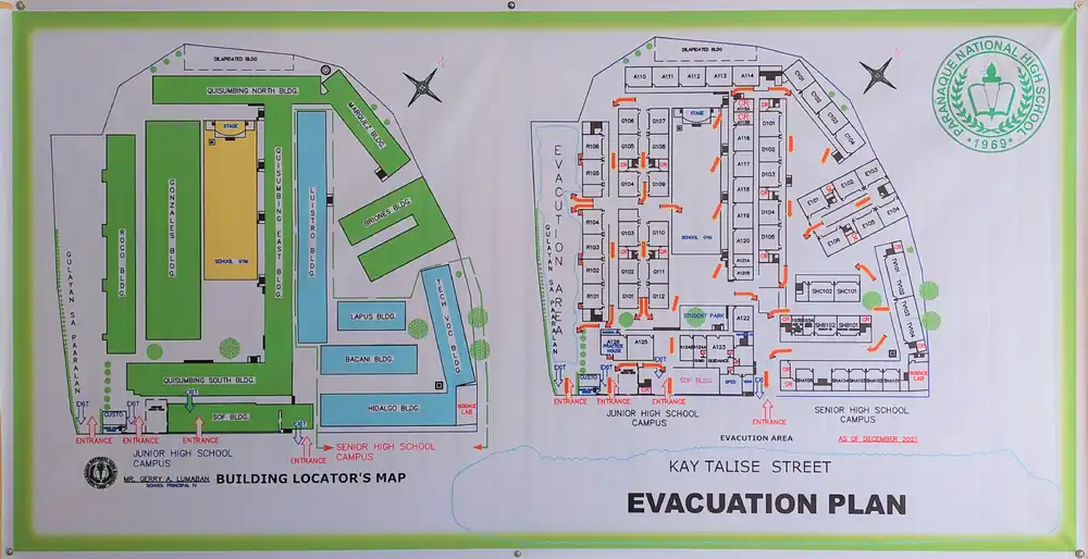 Parañaque National High School-Main is situated in an approximately 12,500 m2 (135,000 sq ft) lot at Kay Talise Street and Dr. A. Santos Avenue, San Dionisio, Parañaque. Because of the relatively large student population while having a relatively small space, overcrowding can become an issue especially during class arrivals and dismissals. The school hosts multiple buildings catering to both junior high school and senior high school students. These buildings vary in age and function, with the oldest building built during the early 1970s and the newest building built during the early 2020s. An interesting thing to note is that many of the school buildings are named after the former and current secretaries of the Department of Education and many of the school buildings are either three-story or four-story buildings.