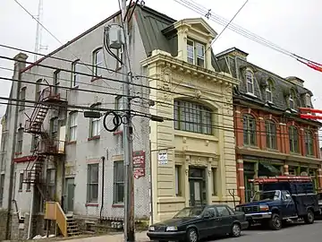 This historic structure was built in two sections; the older dates to 1883 and the second to circa 1900. Both are three-story, brick structures that sit on banked basements. The older section has a patterned slate mansard roof with rounded dormer windows and was designed in the Second Empire style. The addition is faced in concrete, with floral patterns, a lion's head, and the bank's insignia. It generally represents the Classical Revival style. The building has been converted to apartments.[2]