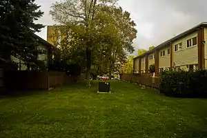 It is a mixed-dwelling suburb, having apartment blocks, townhouses and an assortment of single-family houses. The development is largely the work of the building company, Minto, which maintains ownership of many of the multi-residence buildings.[8] The tract has been developed over the past half-century and is largely complete.[9] The development was planned by architect John Russell in 1959. He was influenced by Californian community layouts and house models,[10] but see Ottawa urban planning. The building took place between 1959 and 1972.[11] In 1967 Minto built the first high-rise condominium development in Canada, called Horizon House, and located on Meadowlands Drive at Chesterton.