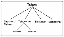 The different ethnic groups that are recognized under the broad term "Tehuelche" spoke languages whose exact quantity and relationships have been subject to different opinions. For Roberto Lehmann Nitsche, the languages stemming from the Pampas and Patagonia divided in to two groups, the Chonan languages and the Het languages.[18][19] The available evidence distinguishes between six languages in the Tehuelche complex: the Chon group (Teushen, Aoenek'enk, Selk'nam and Haush), the language of the Gününa küne indigenous group and the language of the Querandí people.[20]