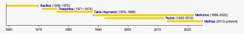 2013–present Reign disputed by followers of Abune Merkorios until 2018.[11][12][9]