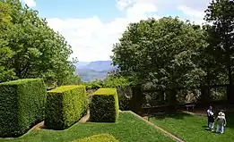He made use of the surrounding outlooks and natural vegetation and he did use large native trees—such as the Illawarra flame trees and coastal cypress pine at "Gleniffer Brae"—when and where it suited his design. In the garden of "Mahratta", he mixed native trees with exotics.[11] At "Everglades", he created a small waterfall and "grotto pool" of natural appearance—clearly influenced by the natural watercourses of the Blue Mountains—and the garden has a lookout overlooking Gordon Falls and the Jamison Valley[39][3][40] Similarly, at "Leuralla", the garden overlooks the Jamison Valley. At "Gleniffer Brae", the garden framed views of nearby Mount Keira and at Mt Keira Scout Camp, he made advantage of distant views to the ocean.[41] However, Sorensen planned his gardens so that plantings screened views and other features, which were gradually revealed only by moving through the garden space.[3]
