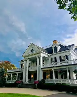 Lounsbury House, formerly known as Grovelawn and as the Ridgefield Veterans Memorial Community Center, is a historic house at 316 Main Street in Ridgefield, Connecticut. It is a two-story wood frame Classical Revival-style building that was built in 1895. Its design, by Charles Northrop, was an emulation of the Connecticut State Building exhibited at the 1893 Columbian Exposition, at the request of Governor Phineas C. Lounsbury, who attended the exhibition. It served as his family home. Lounsbury died in 1925, and his heirs gave the house to the town in 1945.[2] The House and classic gardens now serve as a venue for weddings, corporate meetings, art gatherings, festivals and special events.