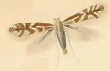 The wingspan is 8–9 mm.[2] The antennae with the apex whitish. Forewings golden-brown, sprinkled with dark fuscous; a slender white median streak from base to near middle; a triangular white dorsal spot at 1/3 reaching basal streak; an angulated sometimes interrupted median fascia, three ill-defined posterior costal and two dorsal spots white, anteriorly dark margined; an elongate blackish apical dot. Hindwings are dark grey. The larva is pale yellowish; dorsal line greenish; head pale brown.[3]