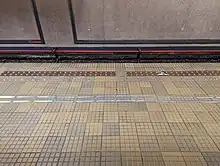 M1 platform of Piața Victoriei metro station showing the tactile paving for visually impaired pedestrians.