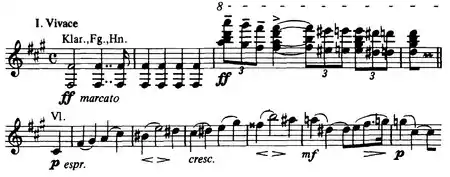 This contrast with the later works can be heard from the opening bars, where a brass fanfare precedes a flourish of double octaves and chords on the piano – a musical gesture similar to the Schumann and Grieg piano concertos. This flourish occurs later in the movement, as well, an important factor in the symmetry of the movement. The main theme (like the other themes in this work common to both versions) is short by Rachmaninoff's standards but already shows the sequential devices and arch-like design inherent in his later works.[2]