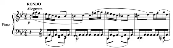 The fourth movement is in a rondo form: A–B–A–C–A–B–A–Coda.[2] The first "A" theme starts in the tonic key, and the "B" theme transitions into the dominant key with big grand arpeggios in the right hand using a good portion of the keyboard. After the arpeggios, both hands play around with the "A" theme's melody before arriving back to the tonic key at the second "A" theme (with very little deviation from the first "A" theme). Suddenly, the "C" theme begins with a key change into B♭ minor (although not marked in the key signature). The sharp forte chords, although in stark contrast with the rest of the rondo, bear some resemblance to the first few chords of the "B" theme. The right hand then plays urgent thirty-second notes while the left hand supports with staccato sixteenth notes. This reaches a climax, a call-and-response play on the beginning of the "C" theme, and the thirty-second-note passage with the climax again.