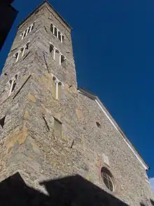 The church was built in the 10th–11th century, atop an older church of which only part of the facade remains. The first document mentioning the church dates back to 1128.[1] The church was enlarged in the 16th century.[2] The almost bare stone facade is unusual for its portal with caryatid pilasters. The marble architrave is decorated with angels and festoons of fruit. The portal once had three 15th-century marble statues of Saints Peter, Paul, and Andrew, now moved inside of the church. The facade also has a seal of the town, carved in stone, consisting of a shield and eight pointed stars, in reference to the Statutes of the Comune of Sarzana in 1330. The portal has a mullioned window, and three arches surmounted by small busts. The square Romanesque bell-tower has increasing mullion arches as it rises. Above the entrance portal is a mullioned window.