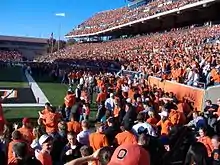 On 2 November 2015, students at the University of Kansas illegally broke into Memorial Stadium and tore down the goalpost at the south end of the field following the Kansas City Royals' World Series clinching victory vs. the New York Mets at Citi Field.[31] The goalposts at the stadium were also torn down after victories by the Jayhawks, vs. Nebraska in 2005 and 2007, West Virginia in 2013, Iowa State in 2014, Texas in 2016, Oklahoma State in 2022, Oklahoma in 2023, and in 1994 by fans of archrival Kansas State.