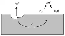 elsewhere outside the pit) developing on a metal immersed into an aqueous solution containing dissolved oxygen. Here, the pH conditions are neutral or alkaline (presence of OH