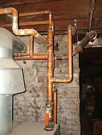 Plumbing is any system that conveys fluids for a wide range of applications. Plumbing uses pipes, valves, plumbing fixtures, tanks, and other apparatuses to convey fluids.[1] Heating and cooling (HVAC), waste removal, and potable water delivery are among the most common uses for plumbing, but it is not limited to these applications.[2] The word derives from the Latin for lead, plumbum, as the first effective pipes used in the Roman era were lead pipes.[3]