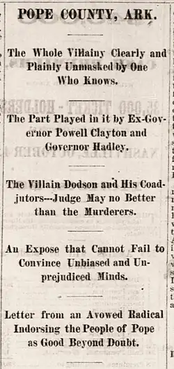 - ↑ "Pope County—Truthful Statement of the Cause of the Troubles, by a Republican". Daily Arkansas Gazette. No. 91, 54th year. Little Rock, Arkansas: Woodruff & Adams. March 6, 1873. p. 2. Retrieved 29 March 2023.