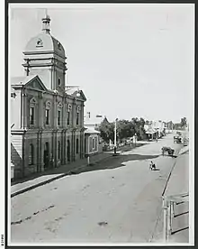 The building was severely damaged by fire in 1944, with the main hall, gallery, mayor's parlour, supper room, stage, dressing and cloak rooms, and mothers' and babies' association all destroyed. The facade, council chamber and town council office were saved.[3] It suffered a further wall collapse while being used as an open-air entertainment venue in 1945 while awaiting reconstruction.[4] It was rebuilt in 1946 at a cost of £30,000, and opened in August by Governor Willoughby Norrie.[5] The original facade was retained as part of the rebuilt town hall.[6]