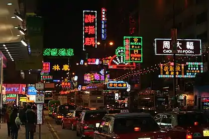 A brightly lit Nathan Road, Kowloon, looking south, near the intersection with Saigon Street.