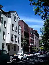Manar, in Macleay Street, is a complex of three blocks of flats which dates back from the original house c.1880 through to the Inter-war Free Classical style buildings of the 1920s. They are two to three stories in height with cement rendered masonry walls and terracotta tiles roofs. The 1920s wings were designed by the architectural practice of Ernest A Scott and Green (1911–1932), later known as Scott Green and Scott (1932–1947). Residents of Manar have included William Parker who served as Master in Lunacy in the Supreme Court of New South Wales,[9] Sir Mungo William MacCallum, Sydney Ure Smith, Sir Garfield Barwick, Senator John Ignatius Armstrong, Mary McEwen, widow of Sir John McEwen, and Mary Bailey-Tart, the only daughter of Sir Earle Page[10]