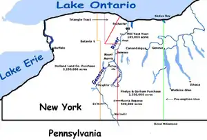 The Preemption Line (also spelled Pre-Emption) divided the aboriginal lands of western New York State awarded to New York from those awarded to Commonwealth of Massachusetts by the Treaty of Hartford of 1786.[1] It was defined as the meridian (north–south) line from the eighty-second milestone of the Pennsylvania–New York survey line at 76° 57' 58" W northward to Lake Ontario.