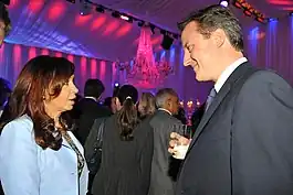 In September 2010, it was announced that Argentina was elected president of the Group of 77+China and prepared to act as a ‘bridge" with G-20 major economies to which it also belongs.[82] She visited Chile during their Bicentenary celebrations where she also assisted at the baptism of a Chilean baby, Anaís Escobar Maldonado, born in the Argentine Hospital deployed at Curico after the earthquake. The visit had a high profile in the media mainly because of the possible extradition to Chile of Sergio Apablaza. She met with president Sebastián Piñera and participated in the festivities at the national stadium.[83] She also confirmed the celebration of the III bi-national cabinet meeting for next October.[84][85] Fernández de Kirchner then departed for New York to give her United Nations General Assembly speech where she once again criticized Britain over the Falklands (Malvinas) issue, and Iran for the 1994 AMIA bombing whilst giving her support for an Israeli-Palestinian dialogue and an eventual Palestinian state.[86] On 30 September she hosted the UNASUR presidents' emergency summit at Buenos Aires due to the Ecuador crisis and started an official visit to Germany the following day in order to participate as a Guest of Honour at the Frankfurt Book Fair[87] and meet with Chancellor Angela Merkel. In October she inaugurates the III News Agencies World Congress to be held in Bariloche.[88] This same month, and as part of the 2006 civilian nuclear-power reactivation program, Fernández reopened the Pilcaniyeu uranium enrichment plant, put on ice in the 1990s, amid worsening shortages of natural gas.[89] Following the death of her spouse (see below), she also resumed activities and flew to South Korea for the G20 Seoul summit. After her return she announces that the Paris Club agrees to debt talks without the International Monetary Fund intervention as proposed by Argentina since 2008. These negotiations will result in the settlement of the last portion of the sovereign debt defaulted in the 2001 crisis after the successful restructuring debts of 2005 and 2009.[90] In November she also participated in the UNASUR Summit at Guyana after which will host the XX Ibero-American Summit at Mar del Plata.