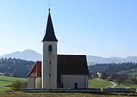 The local church from which the settlement gets its name is dedicated to Saint Primus and Felicianus and belongs to the Parish of Šentjur. It was built in the early 18th century on the site of a 15th-century predecessor.[9] A church at the site was first mentioned in written sources in 1457, when annual fair rights were granted by Emperor Frederick III. The fair was moved to Šentjur in 1583, but then the two events were later combined at the church in Primož pri Šentjurju. The nave of the current structure was vaulted in the mid-18th century, and a bell tower was added in the first half of the 19th century. The main altar is from the second half of the 18th century, and the church also has a Baroque chalice from the mid-18th century. The side altars were created by Janez Rangus from Vojnik in 1853.[5]