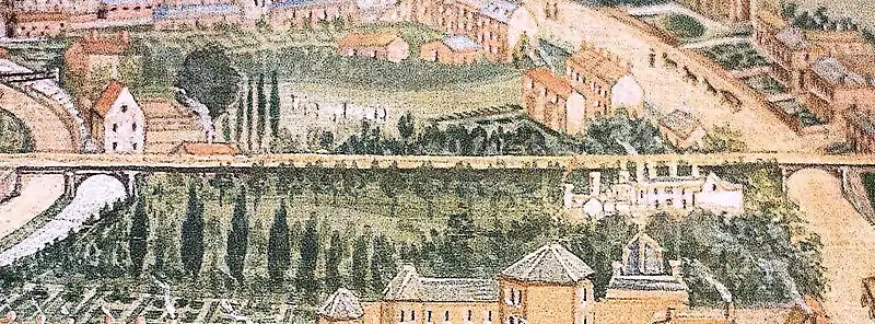 The Priory and its gardens (central white building) in Brown's Panorama of Louth in 1844