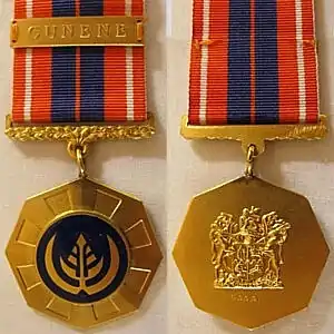 The Pro Patria Medal is an octagonal medallion, struck in bronze and gilded, to fit in a circle 38 mm (1.5 in) in diameter and 3 mm (0.12 in) thick at the centre, with a golden aloe emblem in the centre on a blue roundel, 22 mm (0.87 in) in diameter.[1]
