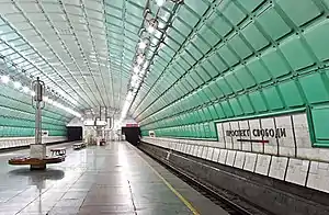 Prospekt Svobody (Ukrainian: Проспект Свободи) is a station on Dnipro Metro's Tsentralno–Zavodska Line. It is a single-vault deep subway station, accessible only by an escalator and was opened on 29 December 1995 along with the rest of the system's first stations. The station is located on the Novokodatska Square on the Prospect Svobody (for which the station is named, "Freedom Avenue").