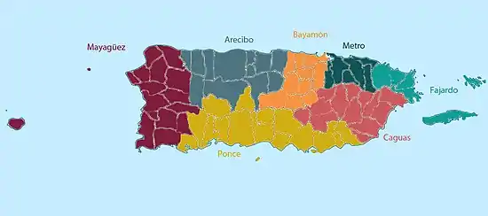 There are seven regions of Puerto Rico as defined by the Department of Health: Arecibo, Bayamón, Caguas, Fajardo, Mayagüez, Metro, and Ponce.[2]