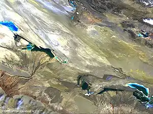 Because of this position, Qaidam forms an endorheic basin accumulating lakes with no outlet to the sea. The area is among the most arid non-polar locations on earth, with some places reporting an aridity index of 0.008–0.04.[10] Across the entire basin, the mean annual rainfall is 26 mm (1 in) but the mean annual evaporation is 3,000–3,200 mm (120–130 in).[4] Because of the low rainfall, these lakes have become saline or dried up completely. Presently, there are four main playas in the basin: Qarhan in the southeast and (from north to south) Kunteyi, Chahanshilatu, and Dalangtan in the northwest.[10] These playas and a few other saline lakes occupy over one-fourth of the basin,[6] with the sediments deposited since the Jurassic as deep as 10[7] to 14 km[4] (6–9 mi) in places despite tectonic activity having repeatedly shifted the center of the region's sedimentation.[10] The seasonal nature and commercial exploitation of some of the lakes makes an exact count problematic: one count reckoned there were 27 lakes in the basin,[11] another reckoned 43 with a total area of 16,509 km2 (6,374 sq mi).[12]