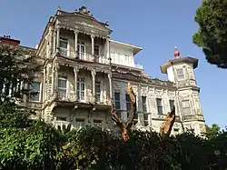 Built in 1906, its architect was Prussian August Carl Friedrich Jasmund,[3] who taught at the Imperial School of Military Engineering (Ottoman Turkish: Mühendishâne-i Berrî-i Hümâyun, today Istanbul Technical University),[1] and designed the Sirkeci railway station.[4] It consists of three buildings, a luxurious one for Pasha, a relative modest one for Tevhide, Pasha's daughter, and a one-storey reception pavilion at the street side.[1] Entry to the premises is through a high wrought-iron double-wing gate.[5] The buildings cover a floor area of 3,406 m2 (36,660 sq ft) with a gross covered area of 2,700 m2 (29,000 sq ft) on a plot of 22,970 m2 (5.68 acres).[6] The mansion's land is a registered protected area.[7] The cost of the mansion was given with 40,000 gold.[1] In later years, the pavilion was demolished, and apartment buildings were constructed on the site.[5]