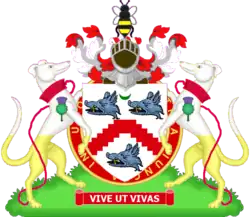 On either side, a greyhound per fess Argent and Or collar and line Gules charged on the shoulder with a thistle proper.