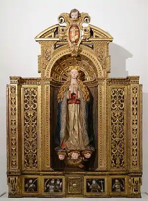 The term reredos is sometimes confused with the term retable. While a reredos generally forms or covers the wall behind an altar,[2] a retable is placed either on the altar or immediately behind and attached to the altar. "Many altars have both a reredos and a retable."[3] But this distinction may not always be observed. The retable may have become part of the reredos when an altar was moved away from the wall. For altars that are against the wall, the retable often sits on top of the altar, at the back, particularly when there is no reredos (in which case a dossal curtain or something similar is used instead of a reredos). The retable may hold flowers and candlesticks.