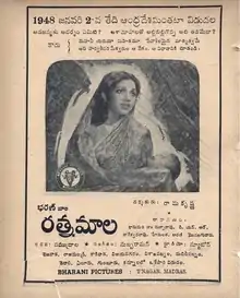 Ratnamala is a 1948 Telugu-language film, produced and directed by P. S. Ramakrishna Rao under the Bharani Studios banner. It stars Bhanumathi and Akkineni Nageswara Rao , with music composed by C. R. Subburaman.[1]