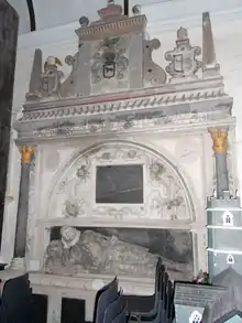 His large monument with semi-recumbent effigy dressed in armour survives in All Hallows Church, Woolfardisworthy. The monument was said in 1978 to retain the original paintwork.[26] The Latin inscription etched onto a slate tablet is largely worn away.[27]