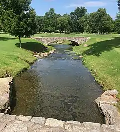 Richland Creek has an approximate elevation of 390 feet (120 m).[5] Its mouth is a south branch of the Cumberland River shown at these coordinates:[lower-alpha 1] 36°09′51″N 86°53′18″W / 36.1642237°N 86.8883339°W. Its source is in west Nashville and consists of the confluence of at least eight streams. One is near Tyne Boulevard at Fredericksburg Drive and mostly follows Tyne northwest toward Belle Meade Boulevard. There it is joined by a Chickering Branch arising near Chickering Lane and flowing along the east side of Chickering Road.[6] After crossing under Belle Meade Boulevard, Richland Creek is joined by its Belle Meade Branch (which flows roughly parallel to Harding Place west of Hillsboro Road) then winds through the golf course of Belle Meade Country Club.