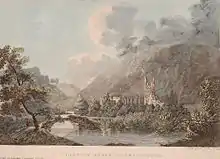 A view of the ruins of Llanthony Priory, with the Honddu in the foreground