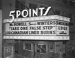 The building was remodeled in 1949 and renamed the Five Points Theater when the marquee was added, which remains to this day. In 1977 the theater closed for several years and an attempt was made to "modernize" the building in 1978 with the application of stucco. In the early 1980s the movie theater shut down, and the acting group River City Playhouse moved into the space in 1984. In 1991 the building was remodeled into a nightclub, Club 5, which closed in 2004.[7]