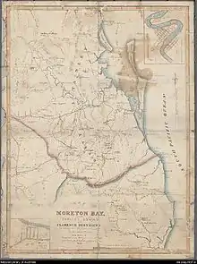 During that year, Dixon, with assistant surveyors Granville Stapylton and James Warner, began a trigonometrical survey of Moreton Bay for the Government to facilitate free settlement.[6] A baseline of 3 miles (4.8 km) was measured on Normanby Plains (today's Harrisville, south of Ipswich) as a foundation for the triangulation. Dixon was instructed to compile a plan of the district for land sales and town reserves.[7][8] This angered Governor Sir George Gipps,[9]