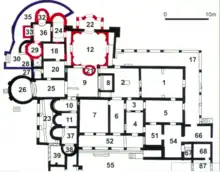 East of the baths, this sector linked the baths to the residential part via portico 59 on one side of the main peristyle of the villa (55) with a geometric polychrome mosaic floor.