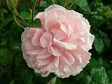 'Strawberry Hill' is a medium, bushy shrub rose, 3 to 4 ft (0.91–1.22 m) in height, with a 3 to 4 ft (0.91–1.22 m) spread.[1] The rose has a strong, myrrh fragrance. Its flowers are large in size, 4 to 5 in (100–130 mm), with a cupped, old rose bloom form. Flower buds are medium-sized and pointed. Bloom colour is a medium pink fading to light pink at the edges. 'Strawberry Hill' blooms in small clusters throughout the season. Leaves are glossy and dark green. The plant is a vigorous grower.[2]