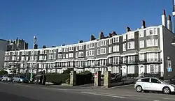 Royal Crescent is a crescent-shaped terrace of houses on the seafront in Brighton, part of the English city of Brighton and Hove. Built in the late 18th and early 19th century as a speculative development on the open cliffs east of Brighton by a wealthy merchant, the 14 lodging houses formed the town's eastern boundary until about 1820. It was the seaside resort's first planned architectural composition, and the first built intentionally to face the sea. The variety of building materials used include black glazed mathematical tiles—a characteristic feature of Brighton's 18th-century architecture. English Heritage has listed the crescent at Grade II* for its architectural and historical importance. An adjacent five-storey building, formerly the Royal Crescent Hotel but now converted into flats with the name Royal Crescent Mansions, is listed separately at Grade II.