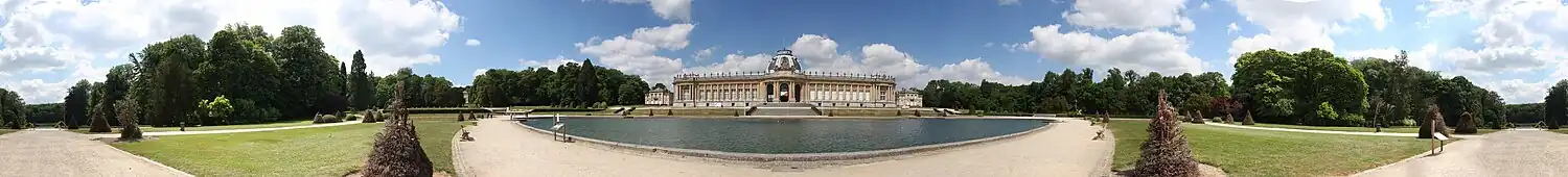 The exhibition's success led to the permanent establishment, in 1898, of the Museum of the Congo (French: Musée du Congo, Dutch: Museum van Kongo), a museum and a scientific institution for the dissemination of colonial propaganda and support for Belgium's colonial activities, and a permanent exhibition was installed in the Palace of the Colonies.[8] A decade later, in 1912, a small, similar museum—the African Museum of Namur—was opened in Namur. The museum began to support academic research, but due to the avid collecting of the scientists, the collection soon grew too large for the museum and enlargement was needed. Tervuren, which had become a rich suburb of Brussels, was once again chosen as the location of the enlarged museum. The new museum started construction in 1904 and was designed by the French architect Charles Girault in neoclassical "palace" architecture, reminiscent of the Petit Palais in Paris, with large gardens extending into the Tervuren Forest (a part of the Sonian Forest). It was officially opened in 1910, a year after the death of Leopold II, by his successor, King Albert I, and named the Museum of the Belgian Congo (French: Musée du Congo Belge, Dutch: Museum van Belgisch-Kongo).[9]