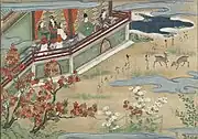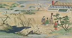 However, the view to the four seasons is incorporated in Mrs. Ozaki's translation: cherry blossom in bloom to the east (spring), buzzing cicadas to the south (summer), multi-colored maple leaves to the west (autumn), and snow-covered ground to the north (winter).[34] This is presumably based on a text edited by Iwaya Sazanami,[35] probably the text of Nihon mukashibanashi (1896),[36] which corresponds roughly with a version from the Otogizōshi.[32] The four seasons also figure in F. Hadland Davis's synopsis (1912).[37] The usual bird which sings in spring is the bush warbler, not actually a nightingale. More precise translations from the otogizōshi text are given elsewhere.[38]