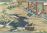 The Ryūgū is well-known as the supernatural place in the fisherman's fairytale Urashima Tarō,[1] and most Japanese now consider it to be a place which supposed to lie under the sea.[2][3] Actually, Ryūgū that appears in other narratives and fairytales (otogi banashi) had been considered to be underwater for a long time,[3] but in the particular case of the Urashima legend, its Dragon Palace was not firmly considered to be underwater until quite late in the modern period.[3]