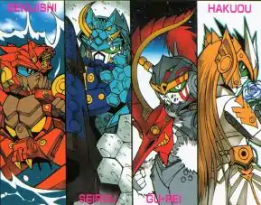 - Koubusai (光武斉(こうぶさい))- An aged and wise Gundam. He warned Kokuryu and Hakuou of the true puppetmaster of the current threats and implied they would need to master their new forms in order to create a new Gigantic Musha powerful enough to defeat this evil. However, both young Gundams misunderstood and have personally boasted they alone will become this powerful warrior.