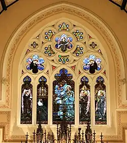 The stained glass windows feature bright colors that were chosen by Bishop Cosgrove.[20] The tall windows on the sides of the nave depict the Twelve Apostles. The rose window on the front of the church includes the following Christian images: an anchor for hope, wheat for bread, a crown for Christ the King, keys for the Apostle Peter, a dove for the Holy Spirit, the cross and crown for the crucifixion, the chalice and bread for the Holy Communion, and a harp for music and worship. The large window over the altar depicts Jesus appearing to St. Margaret Mary Alacoque, who spread the devotion to the Sacred Heart of Jesus.
