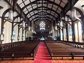 The first electric lights in the cathedral were installed in the sanctuary in 1895.[21] Previously, the church had been lit by gas lighting. A renovation of the cathedral's interior was completed in 1907. It included a frescoing of the interior, enlarging the choir loft, and adding six hundred new lights.[22]